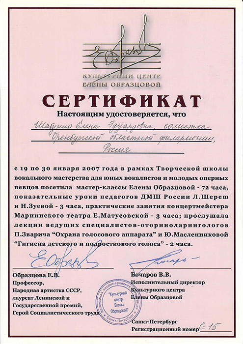 В 2007г. приняла участие в мастер-классах народной артистки СССР Елены Образцовой в г.Санкт-Петербурге, участвовала в концерте, организованном Культурным центром Елены Образцовой, который проводился в Шереметьевском дворце.