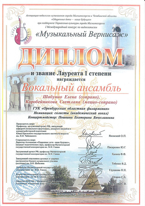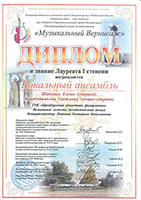В 2013г.на 1 Международном конкурсе по видеозаписям "Музыкальный Вернисаж" получили диплом и звание Лауреата 1 степени.