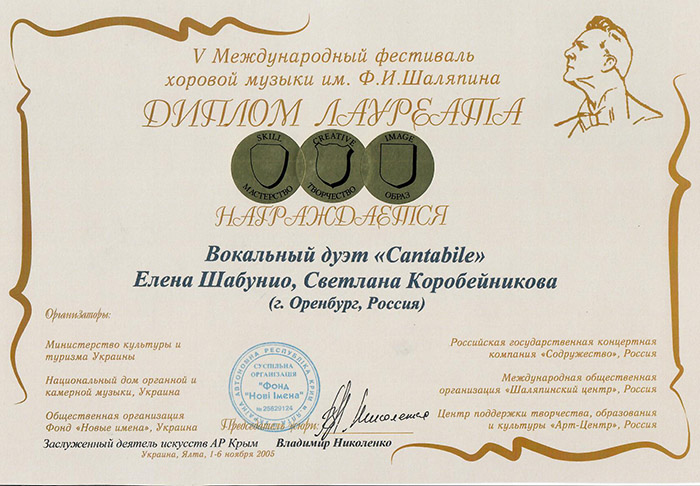 В 2005г. получили Гран-при на 5-м Международном фестивале им. Ф.И. Шаляпина, г. Ялта. (быв. Украина)