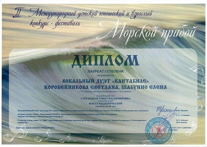 В 2011г. стали Лауреатами первой степени на 2-м Международном конкурсе-фестивале "Морской прибой".
